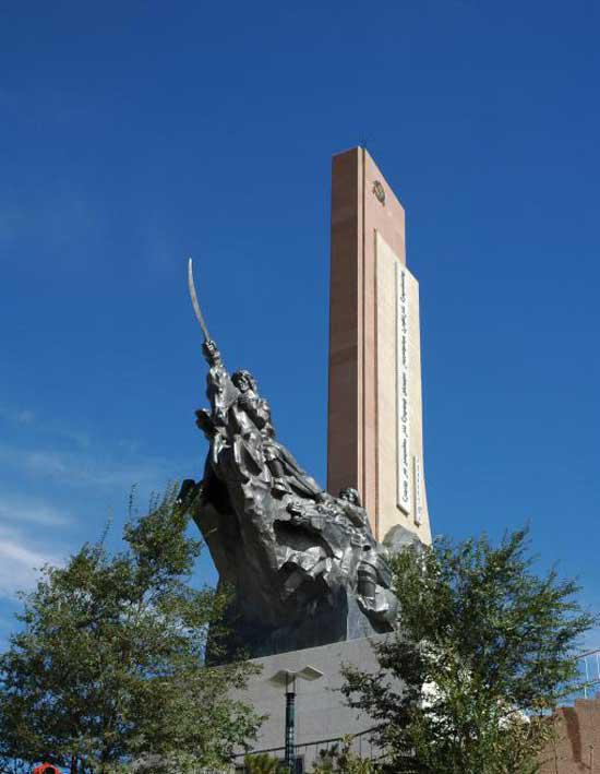 纪念碑用大理石构筑的方行塔基上是粗线条的抗日战士浮雕“群英图”,战马上是一名战士高举战刀,飒爽英姿,碑的主体是直立的长方体柱,两面是分别用蒙汉文字书写的“百灵庙抗日武装暴动纪念碑”。
