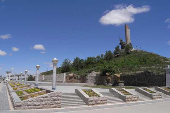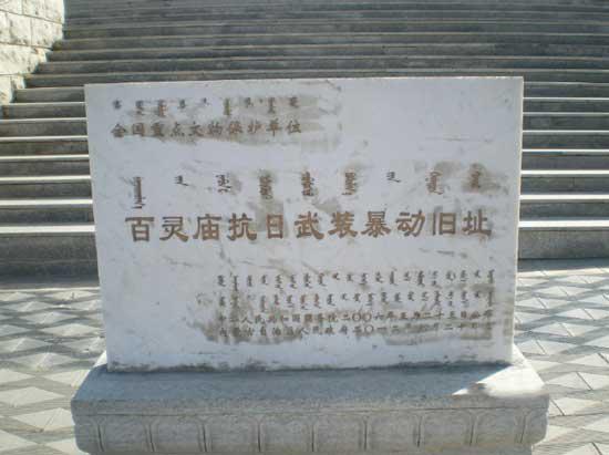 百灵庙抗日纪念碑为纪念1936年百灵庙抗日武装暴动而建,1936年2月21日,百灵庙蒙政会保安队千余名爱国官兵,在中共西蒙工委书记乌兰夫的领导下,由云继先、朱实夫等率领,毅然脱离蒙政会,举行武装暴动,逐步发展成为一支先进的蒙古民族抗日武装队伍。