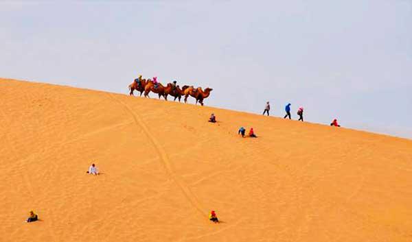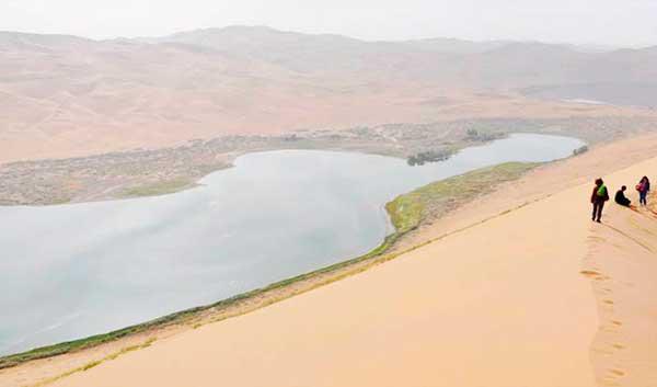 两湖之间是一座大沙峰,游客可以在此骑骆驼,还可以爬到峰顶,再从峰顶滑下,体会鸣沙的乐趣。鸣沙是巴丹吉林沙漠五绝之一,据说巴丹吉林沙漠的鸣沙声音像轰炸机,迥然不同于别处的鸣沙。
