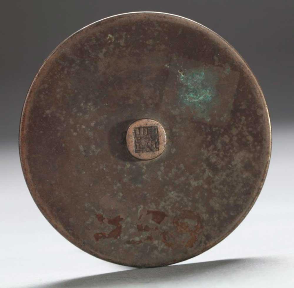 铜质,圆形,旋压宽轮,内铸许由巢父故事图纹,中心制一桥形穿钮,影照光素。